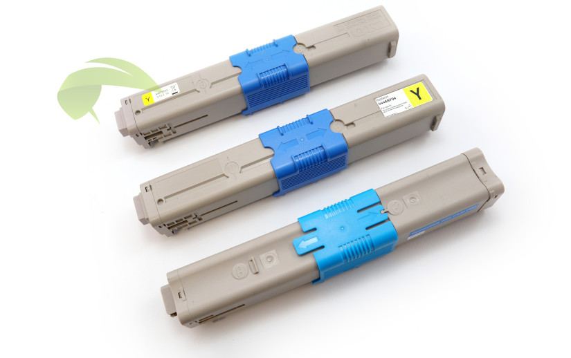 Porovnání tří typů tonerů podle původu. Originální (nahoře) s logem OKI a originální nálepkou. Renovovaný (uprostřed) s nálepkou výrobce, která překrývá logo OKI. Kompatibilní toner (dole) se již na první pohled od ostatních dvou liší konstrukcí.