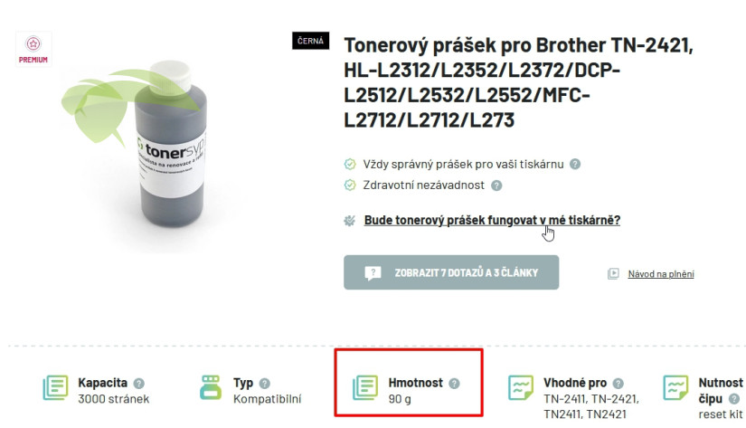 Správné množství prášku lze odměřit i tak, že předem zvážíte prázdnou tonerovou kazetu a průběžně pŕi plnění kontrolujete, kolik prášku v ní přibylo. Tento postup funguje, i když část prášku vysypete mimo kazetu. Průběžné vážení toneru je však u některých modelů složitější a hrozí, že tonerový prášek z kazety vysypete (například u výše uvedeného TN-2421).