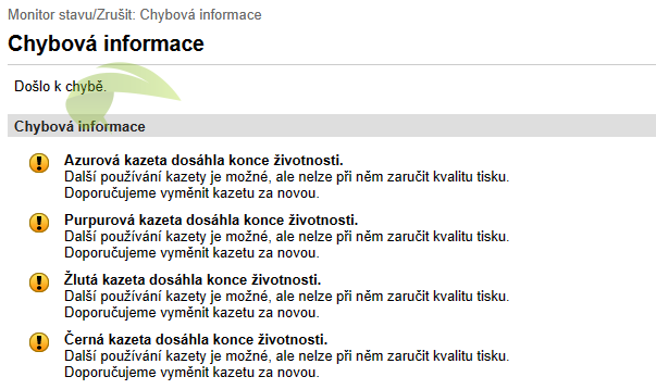 Ve webovém rozhraní tiskárny vypadá toto hlášení takto: