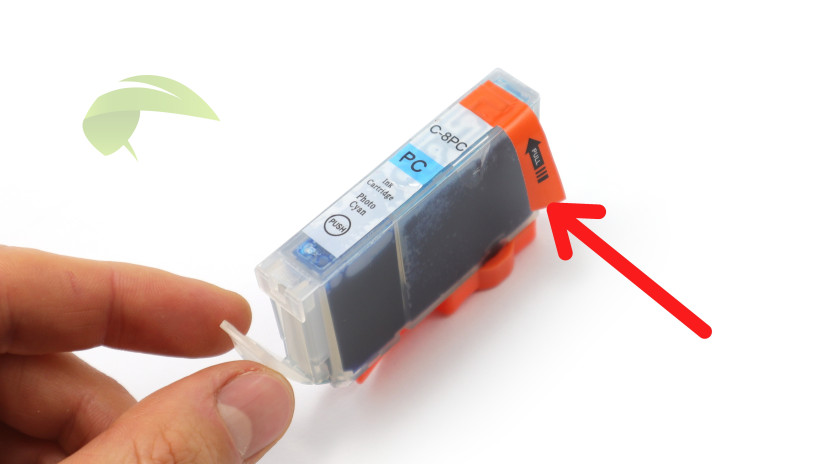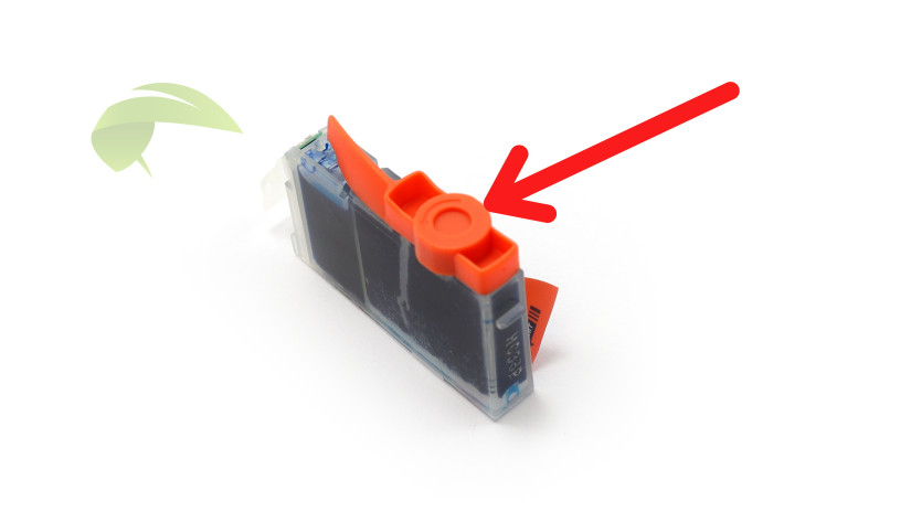 Oranžová krytka na náplni do tiskárny Canon, kterou je nutné před instalací do tiskárny odstranit.